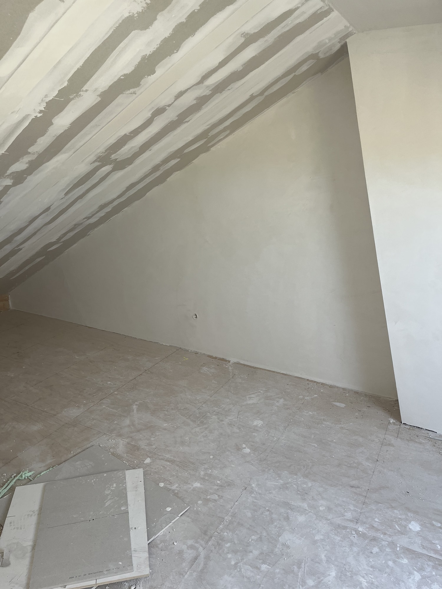 De schuine kanten hebben wij hier op aanvraag van de klanten enkel alleen de naden van de gipsplaten dichtgezet. Dit komt omdat de klant hier in de toekomst wellicht nog dakkappelen wilt plaatsen!