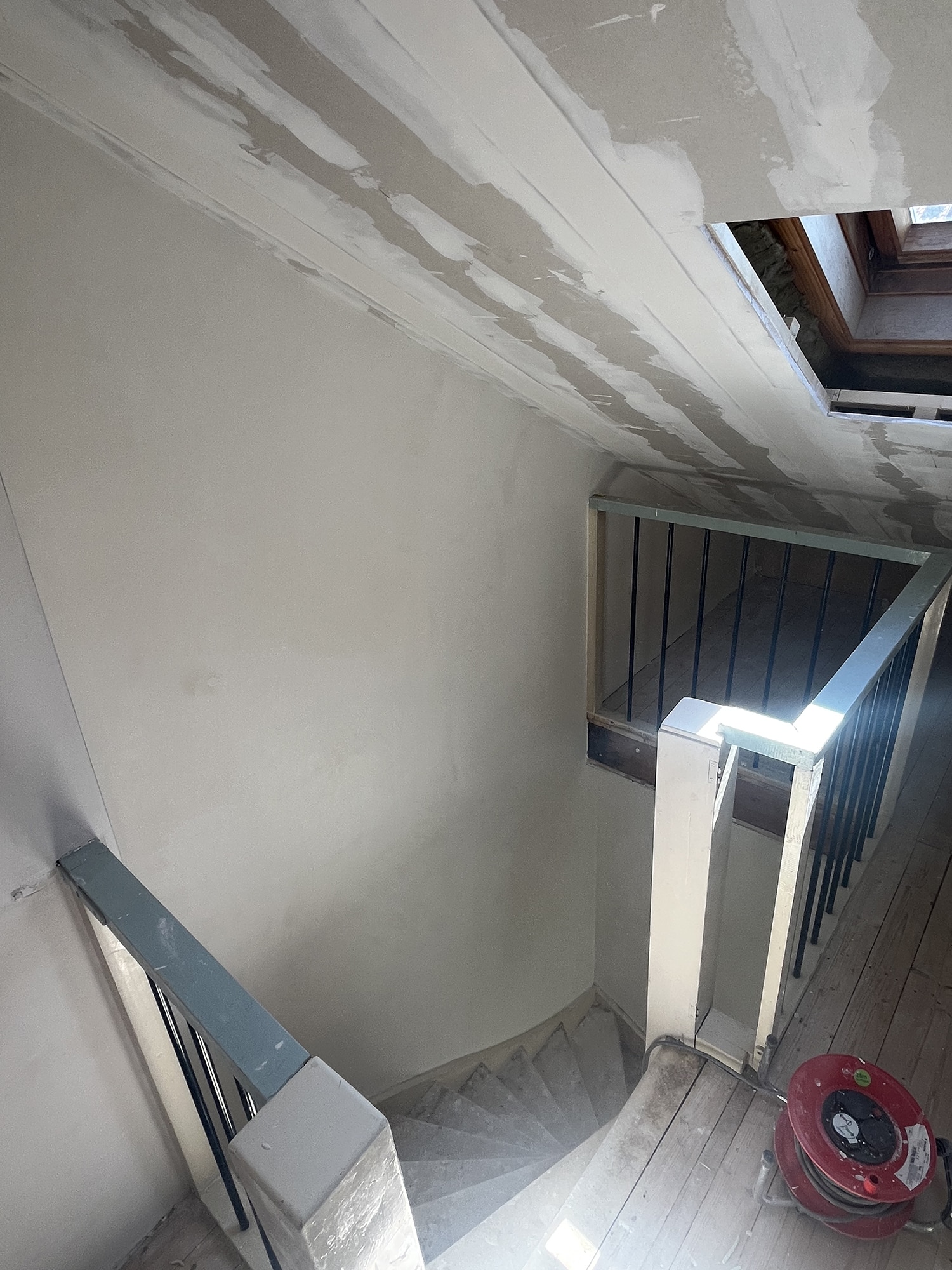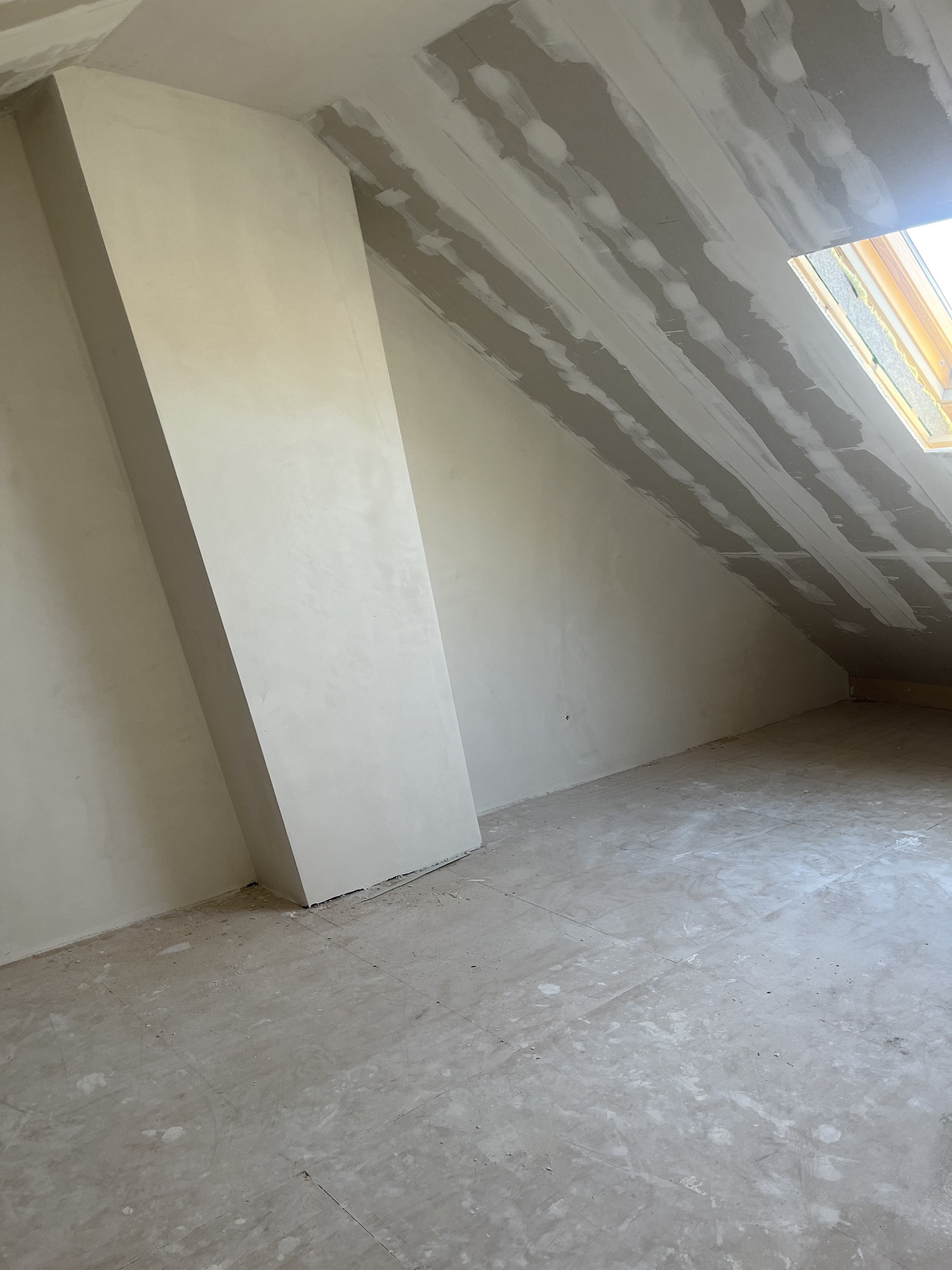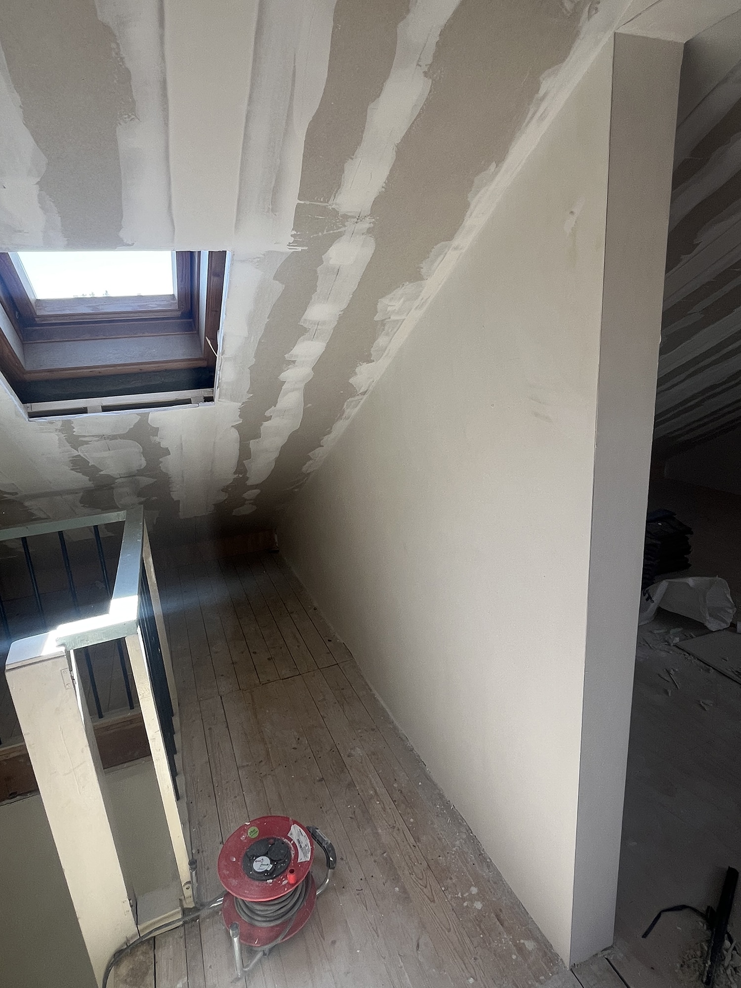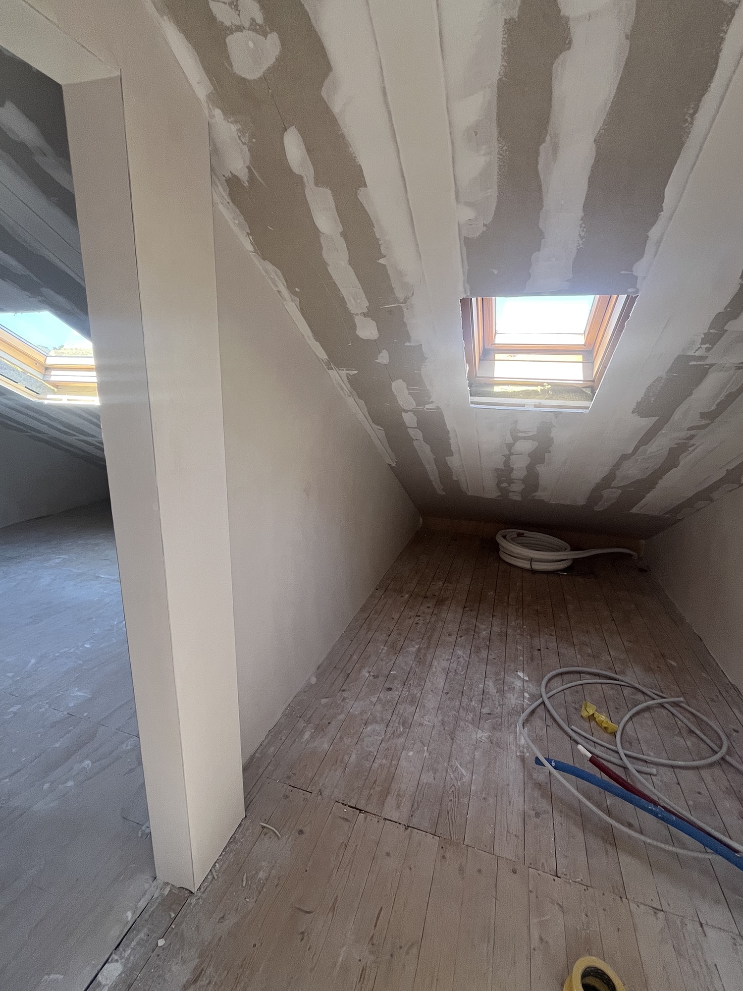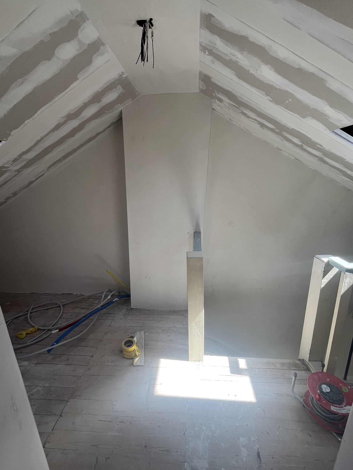 Ook hebben wij hier het trapgat en de zolder voorzien van glad pleister werk , hierdoor staat alles klaar voor de schilder.