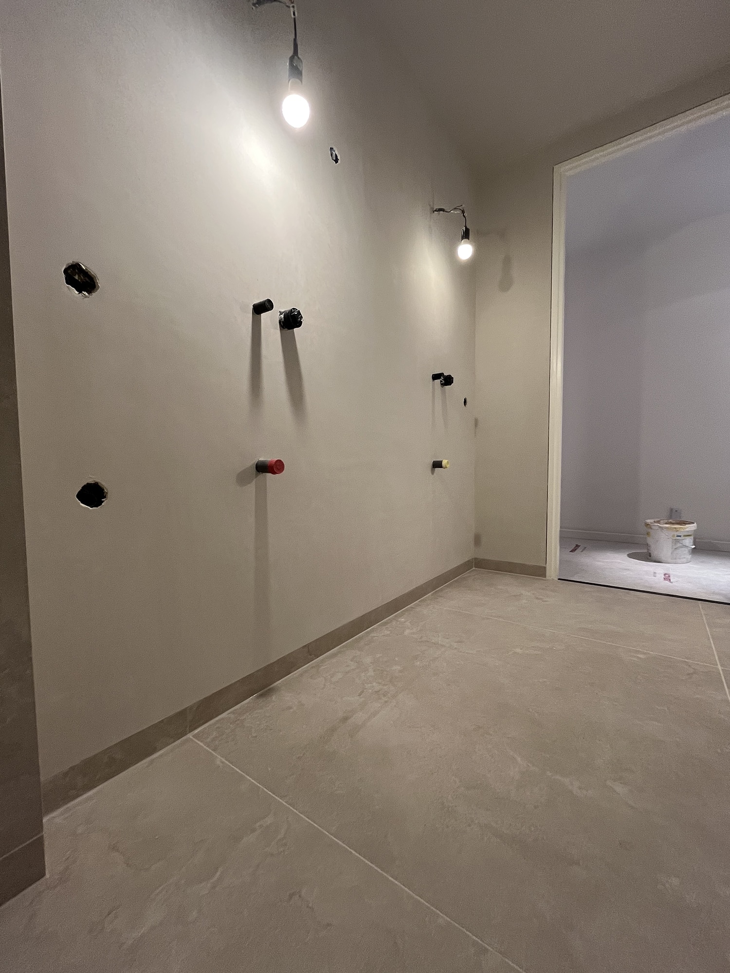 Het pleisterwerk is hier gelijk met de tegelplint gesmeerd, dit zorgt voor een zeer nette en luxe uitstraling.